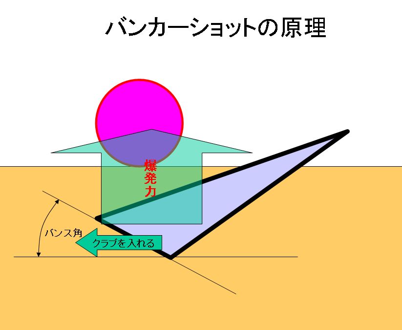 なぜリーディングエッジを60度も開いてフェースが真上を向いた状態なのにバンカーショットが出来るかといいますと、 ~~試しにやってみると理解するのですが~~バンカーショットは二つの作用の合計だからです。「二つの作用」とは、①クラブをボールの下に入れる、と ②砂を爆発させる です。