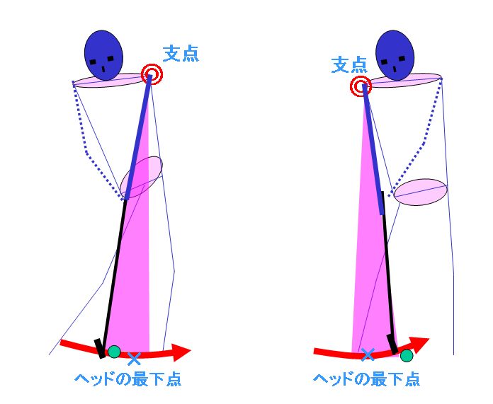 これは決してフェースを開いているからではなくて、スクエアかもしかしたらややフックグリップかもしれませんが、その場で腰を切ってからだを回転させて、左手首を固定したまま手首が返らないように上半身が後から回るイメージですとこのようなフィニッシュとなり、長いクラブでも引っかかりません。それが出来ているのと出来ないのとを比較したのが下の図です。