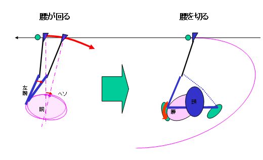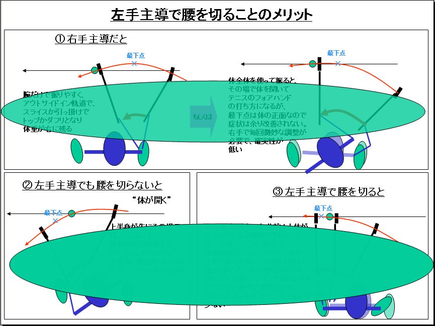 図でお解かりのとおり、論理的にも左腕主導で腰を切ることのメリットが説明できます。