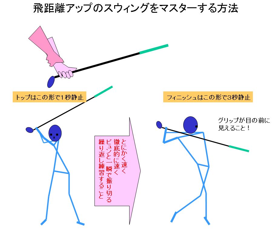 フィニッシュで●●まで、とにかく●●、徹底的に●●、ビュンと●●●練習を繰り返しやってみてください。そのためにはトップからの切り替えしが、●●●●ことから始めることの重要性が自然に身につくはずです。
